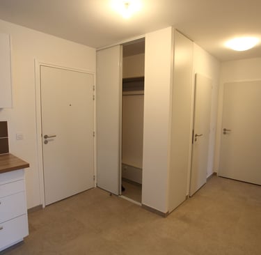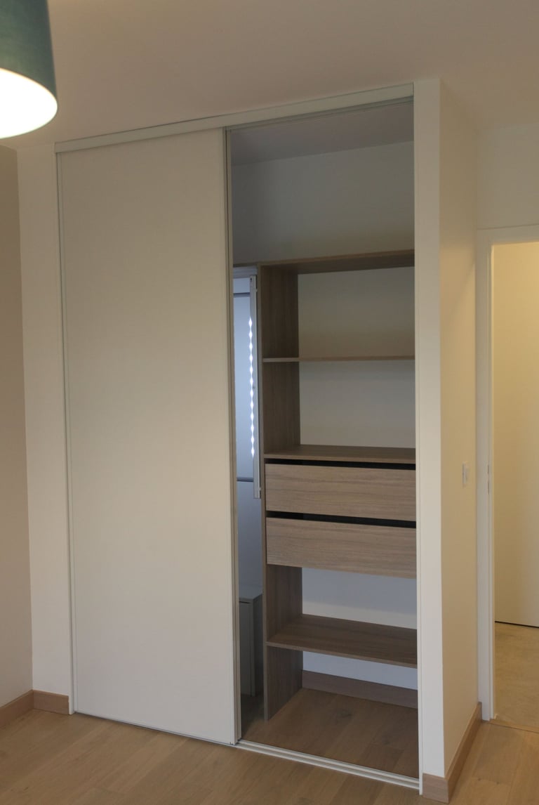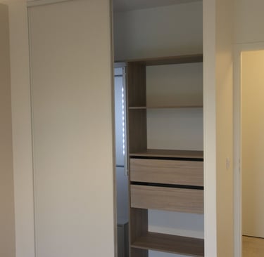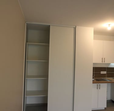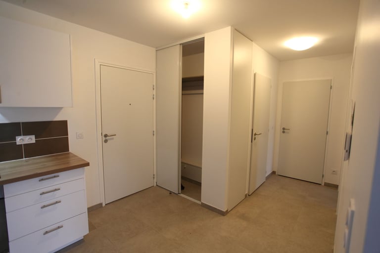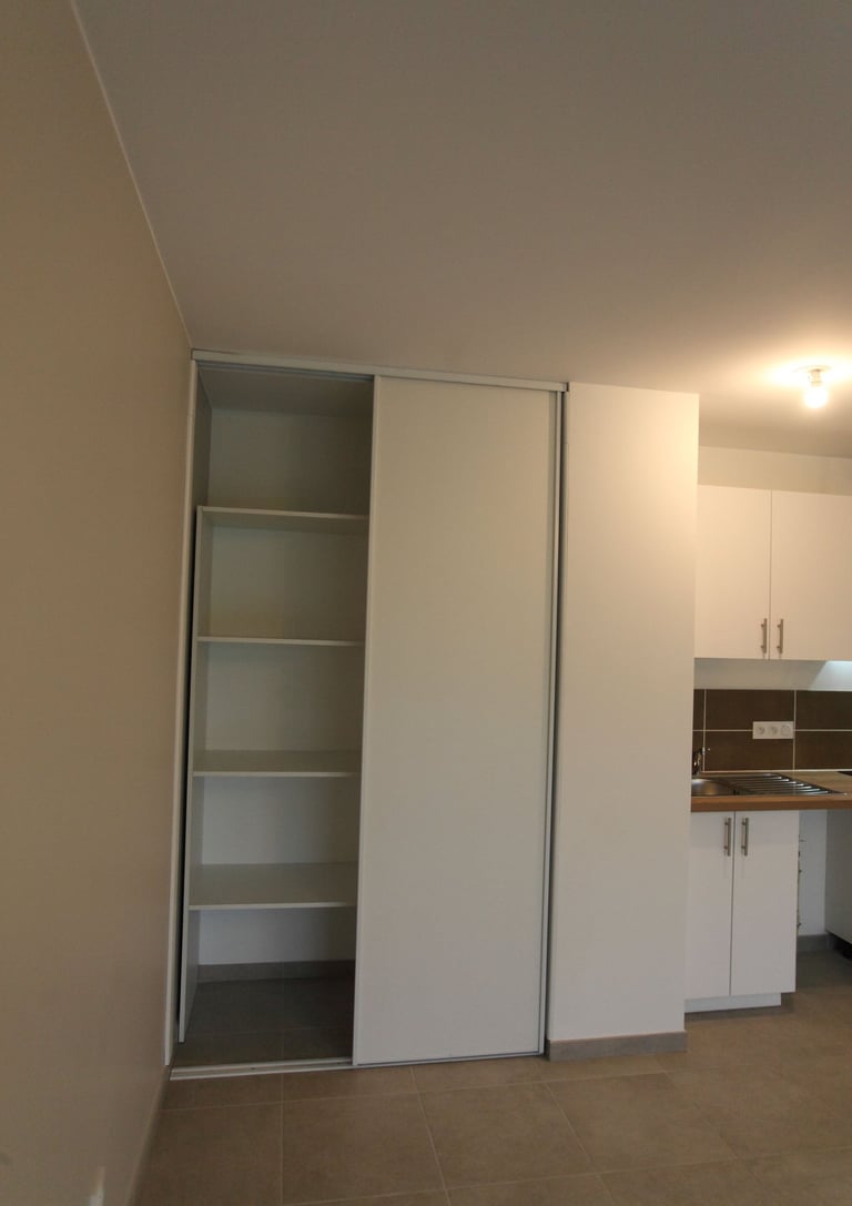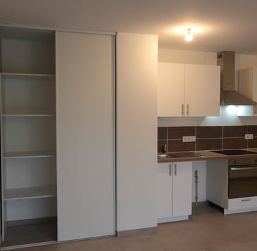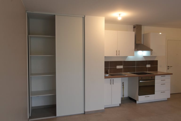 Une cuisine équipée: Rangements, plaque à induction, four, hotte, réfrigérateur.